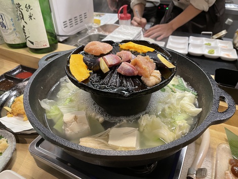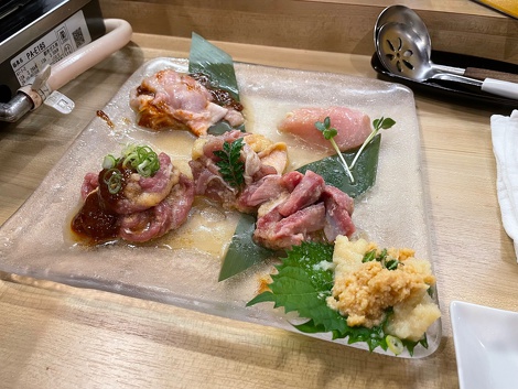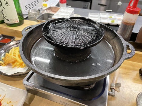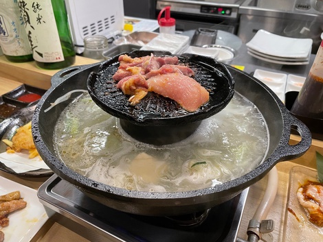 鍋の上の部分で色々な鶏の部位の焼き肉、下の部分が鍋になっていてしゃぶしゃぶが楽しめる焼きしゃぶ鍋だそうです。