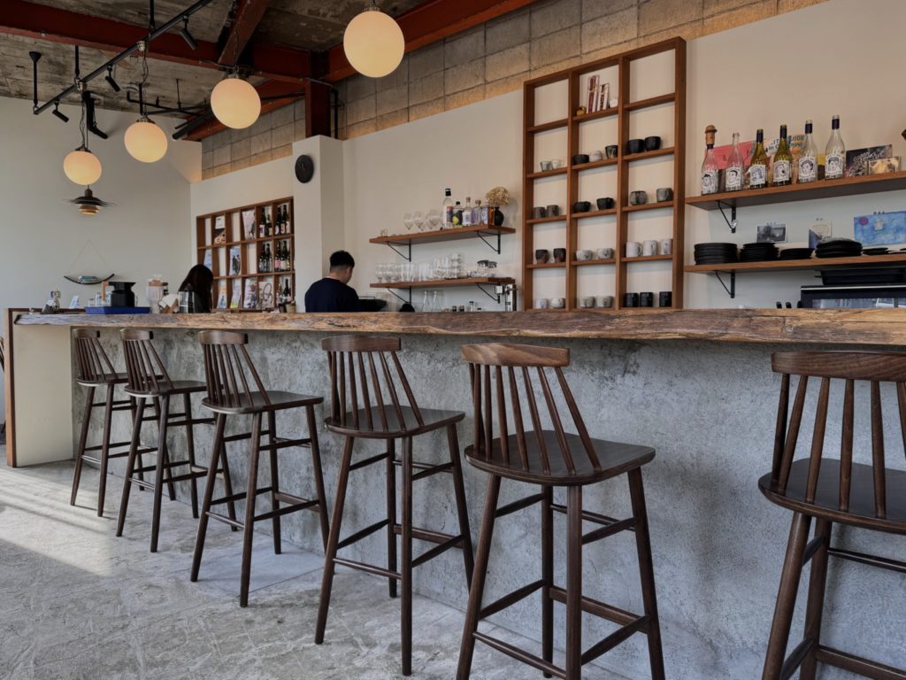 店内は無機質なコンクリートの質感と相性のいい木のカウンターやアンティークな世界観を彷彿とさせるハイチェアや飾り棚、そして両方と相性のいい白い壁