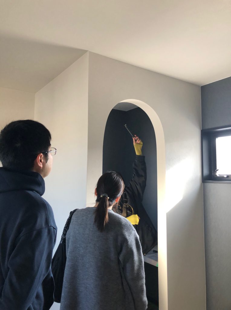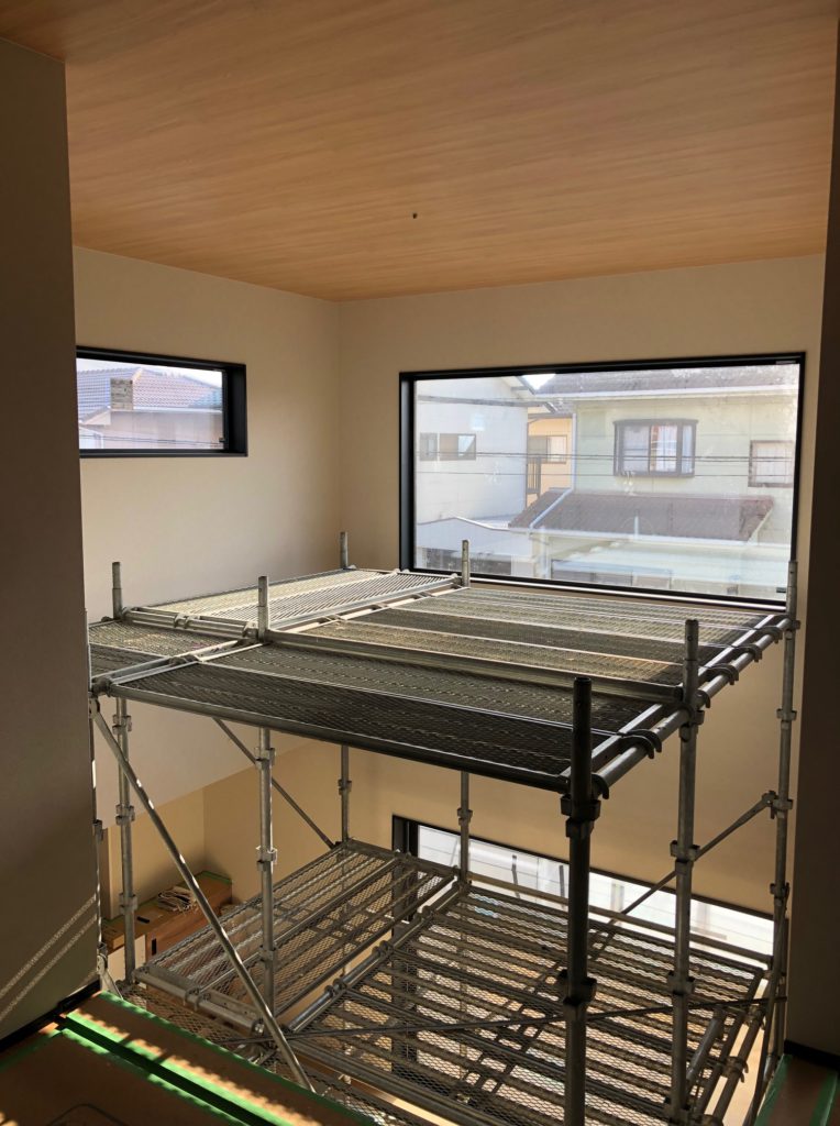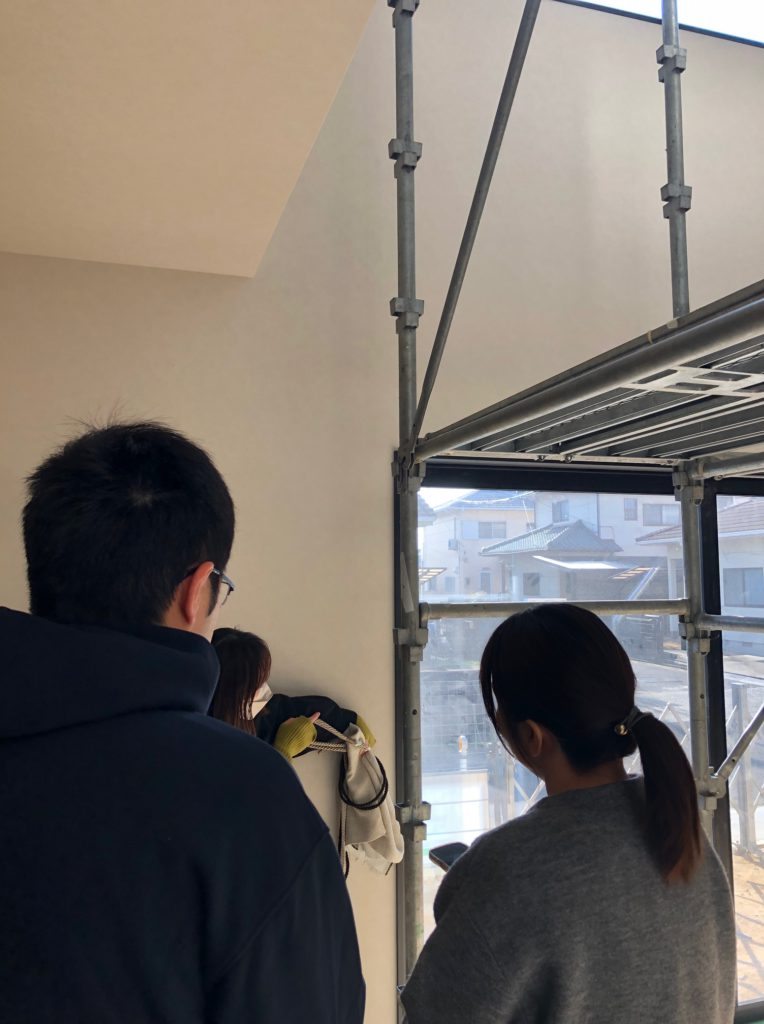 とってもお天気の良い日曜日の午前中、クロスが貼り終わった建築現場でお施主様にお越しいただいてカーテンの最終お打ち合わせを行いました🤗