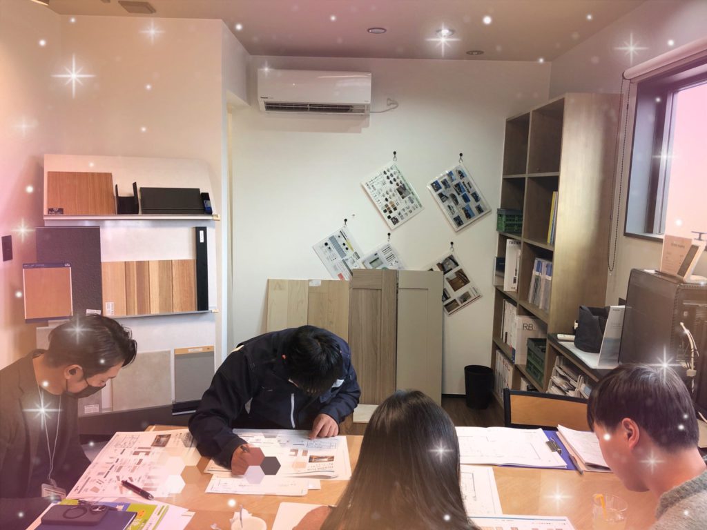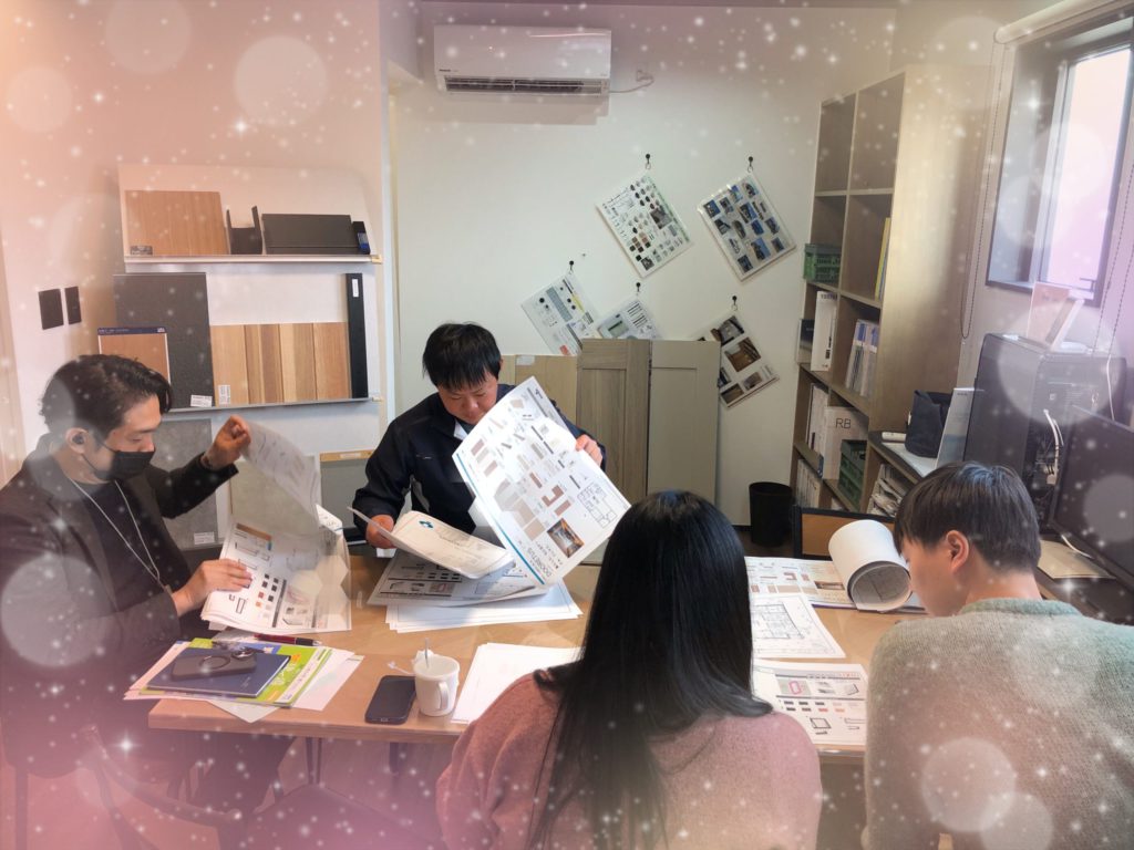 弊社では、営業,プランナーと間取り等のお打ち合わせを重ね、プランが決定した後にインテリアコーディネーターと細かい仕様等を決めていただくお打ち合わせを設けます。