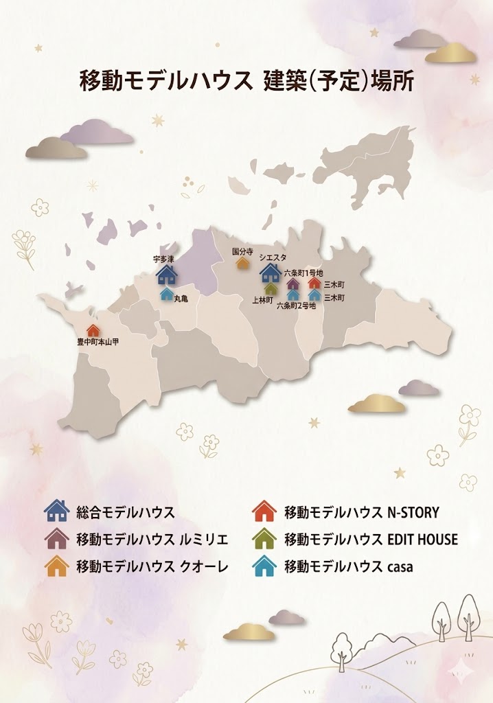 長年出展させていただいております総合モデルハウスはセトラ宇多津展示場とシエスタ21住宅展示場の2拠点とし、移動モデルハウスは現在ごらんいただける3件を筆頭に今後5件を順次オープンする予定です。