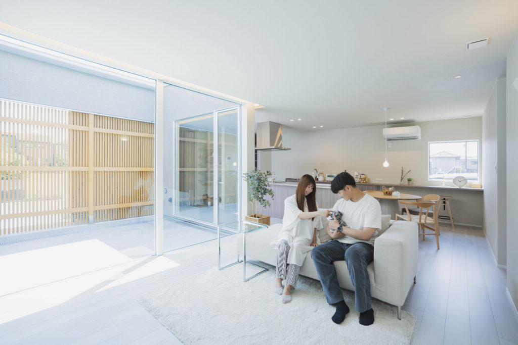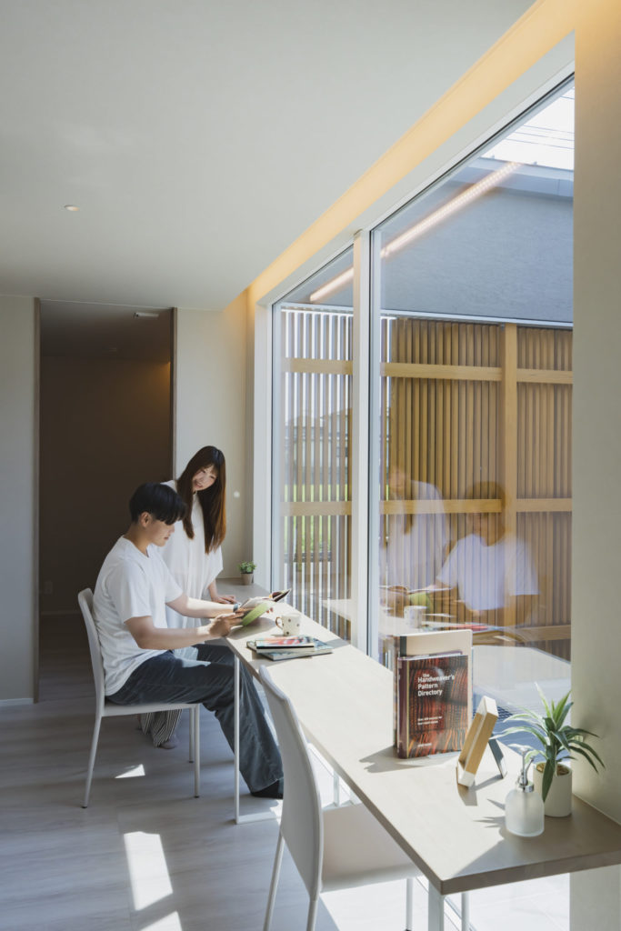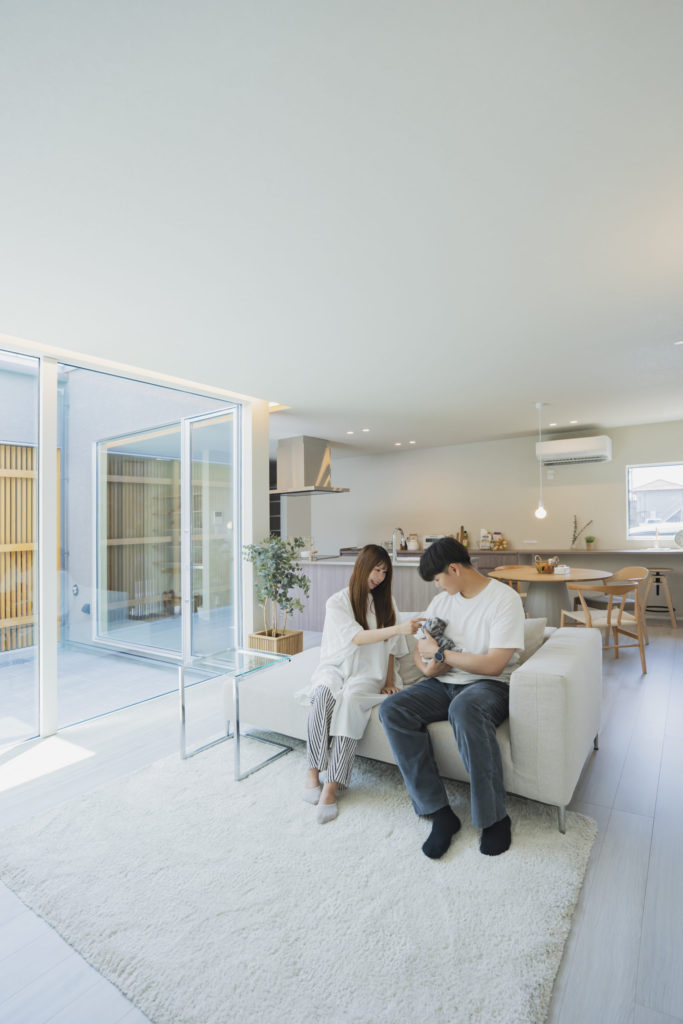 - リビングは中庭と縦ルーバーを配置し、開放的かつ安全性を確保。