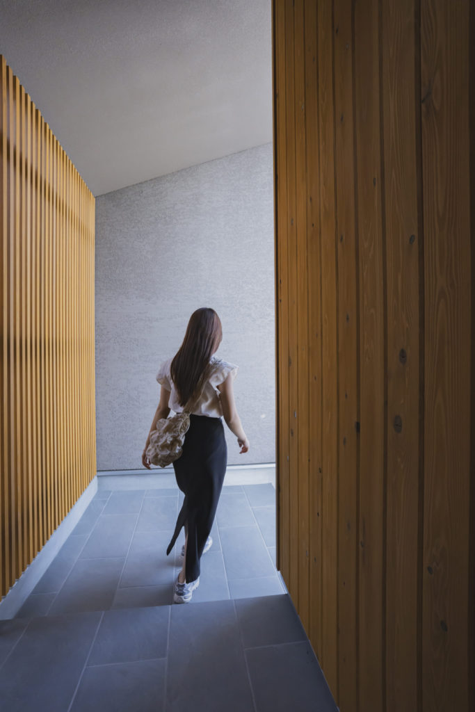 - リビングの開放感: 中庭と縦ルーバーの組み合わせで、プライバシーを守りつつ、カーテンが不要な明るい空間を実現。ペットやお子様が外に飛び出す心配もありません。