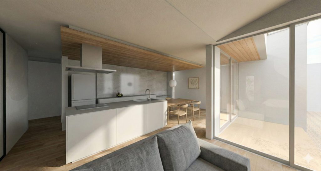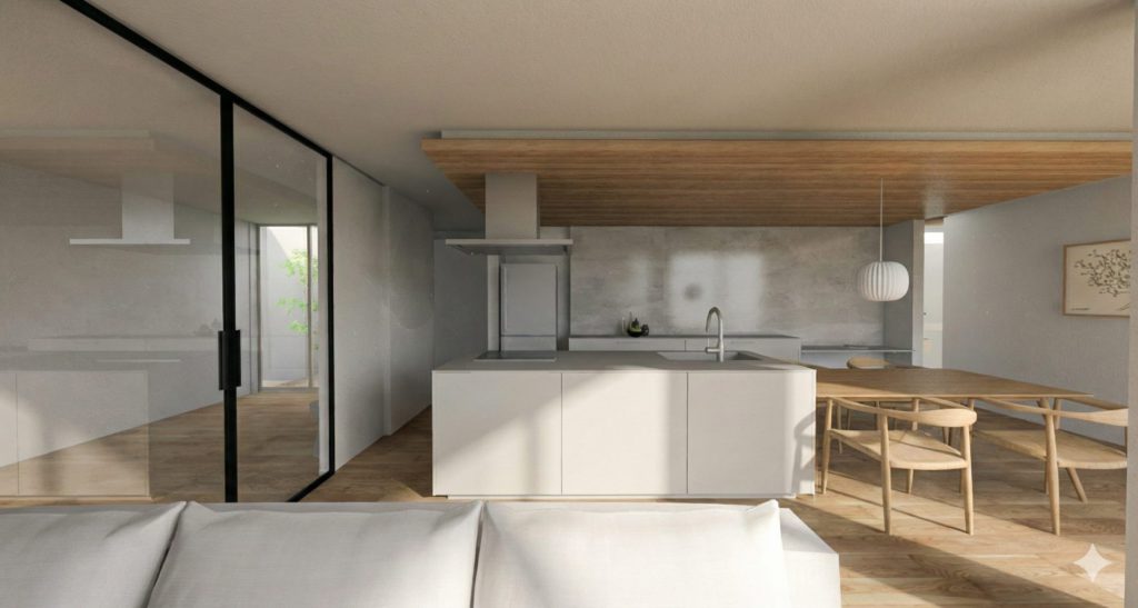 白を基調としたキッチンに、木の質感がやさしく調和するダイニングスペース。すっきりとしたデザインの中に、素材のぬくもりと光のやわらかさが息づいています。家族が自然と集まり、会話が弾む場所。機能性とデザイン性を兼ね備えた、毎日の暮らしがちょっと特別になる空間です。