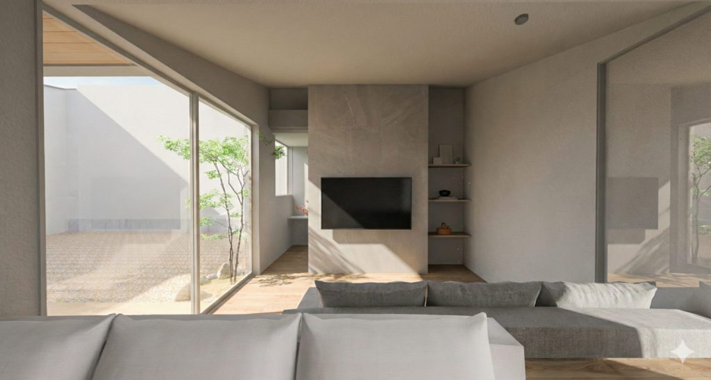 庭とつながる大きな窓から光が差し込み、季節の移ろいを感じながら過ごす穏やかな日常。