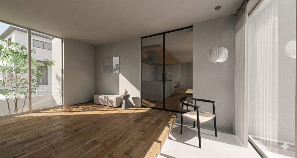 大きな窓から差し込む自然光と、白を基調とした内装が織りなす、明るく開放的な空間。ガラス扉の先に広がるダイニングスペースは、家族や友人との時間を心地よくつなぐ場所。シンプルな中に上質な素材とディテールが息づく、洗練された住まいです。