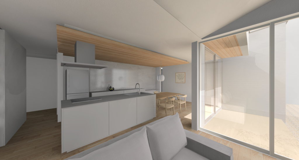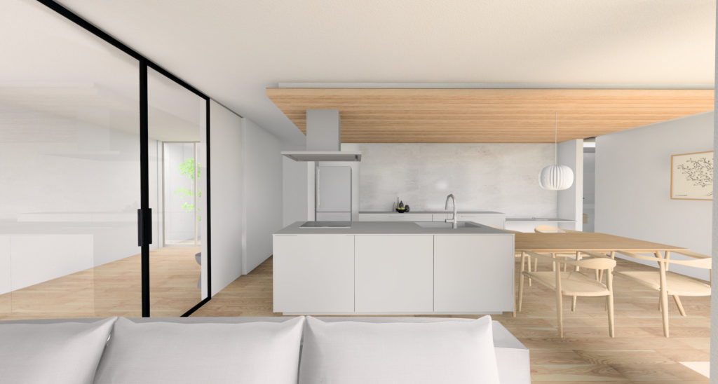 白を基調としたキッチンに、木の質感がやさしく調和するダイニングスペース。すっきりとしたデザインの中に、素材のぬくもりと光のやわらかさが息づいています。家族が自然と集まり、会話が弾む場所。機能性とデザイン性を兼ね備えた、毎日の暮らしがちょっと特別になる空間です。