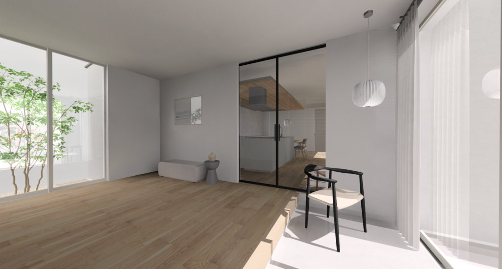 大きな窓から差し込む自然光と、白を基調とした内装が織りなす、明るく開放的な空間。ガラス扉の先に広がるダイニングスペースは、家族や友人との時間を心地よくつなぐ場所。シンプルな中に上質な素材とディテールが息づく、洗練された住まいです。