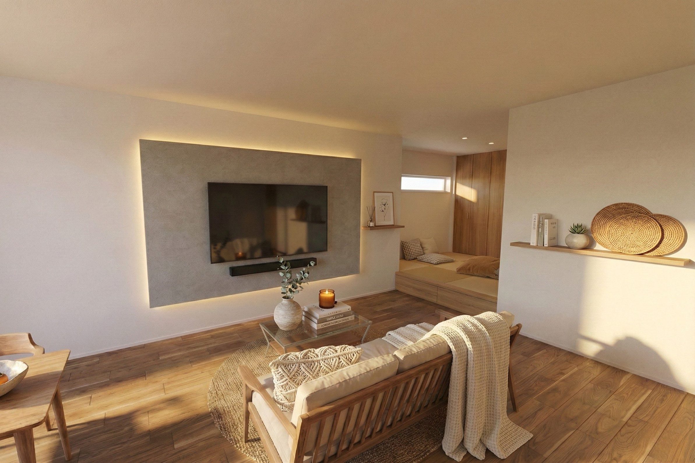 照明に頼りすぎない、素材そのものの良さを活かした設計。小上がりの畳コーナ―は、読書やお昼寝にぴったりの特等席です。