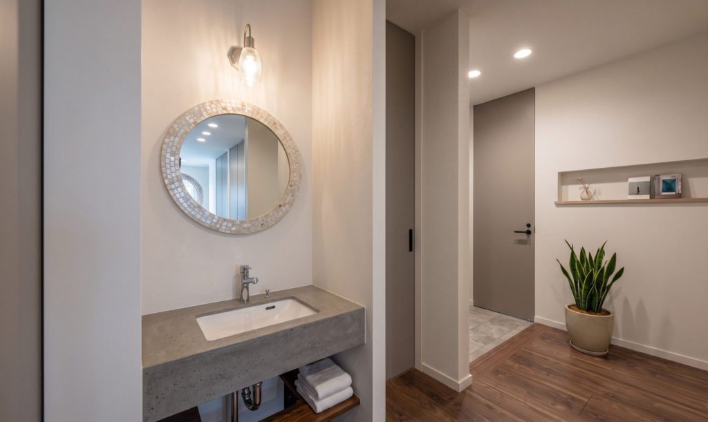 来客時にも使いやすく、生活感を抑えた“魅せる洗面”として空間の印象を高めます。