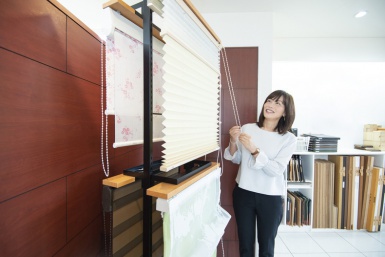 あらかじめコーディネートをしておけることが新築のメリット。生地と色目を選び、窓枠のサイズに合わせてオーダーをします。