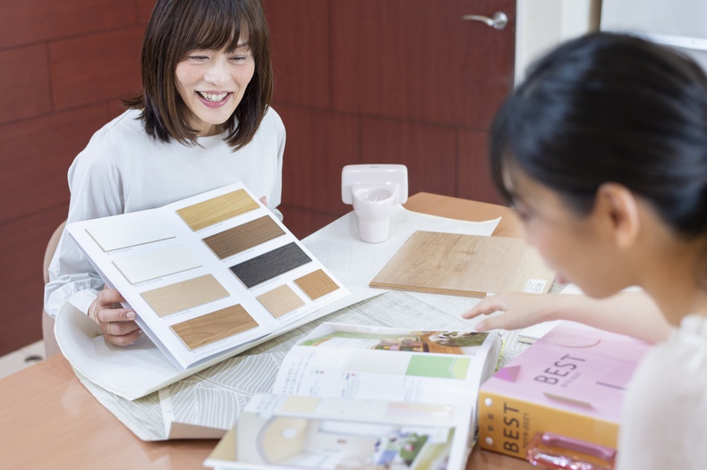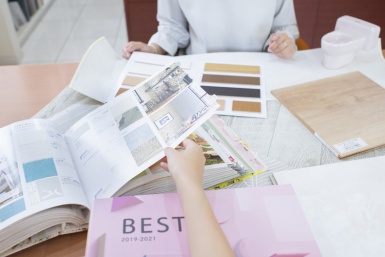 最初のご相談から資金計画と基本プランが決まると、いよいよコーディネートのスタート。コーディネートは「お色決め」といわれ、その名の通り屋根・外壁といった外観と、床・ドア・水回りの設備といった内装の、すべての色目や素材を決めていく作業です。