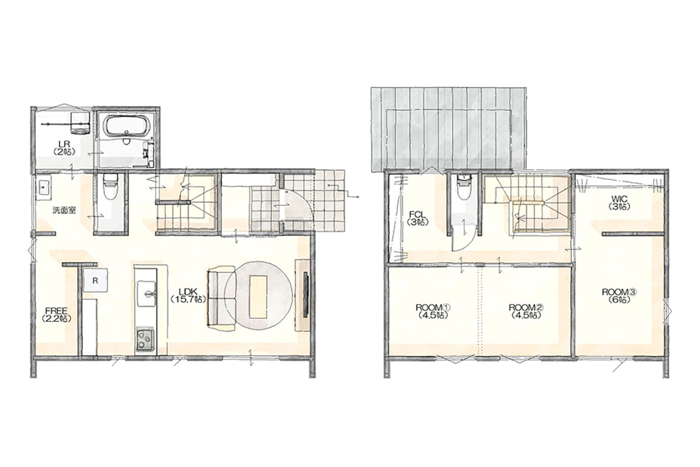 リビング繋がりのタタミコーナーは3帖とコンパクトにすることでおこもり感のあるくつろぎ空間に。居心地の良いヌックとしても◎ コンパクトながらもしっかりプライベート室を3部屋確保。十分すぎる広さの洗面脱衣室はランドリースペースとしても余裕の空間となっています。