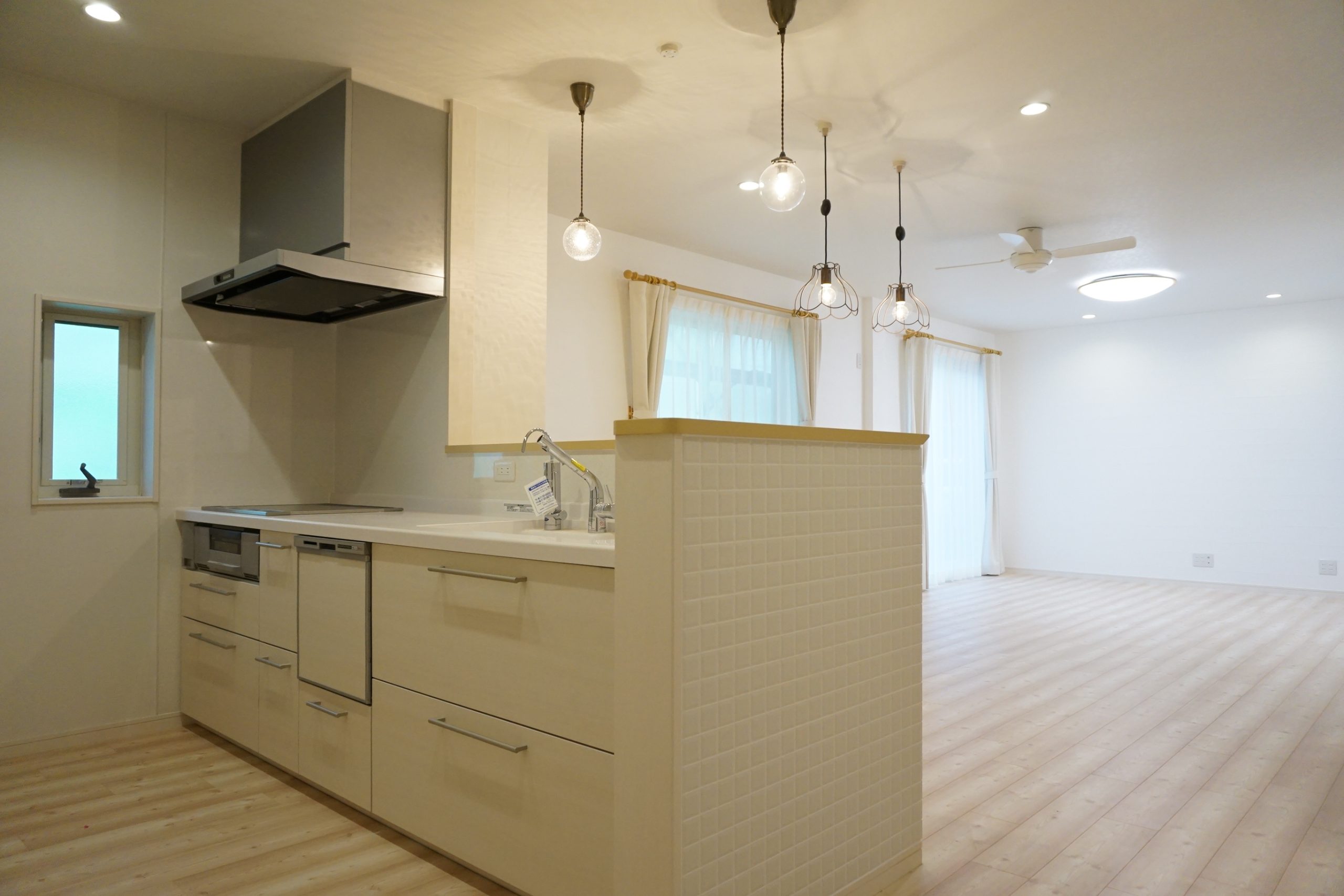 キッチン背面のタイルとペンダント照明が、可愛らしい雰囲気を演出してくれています。