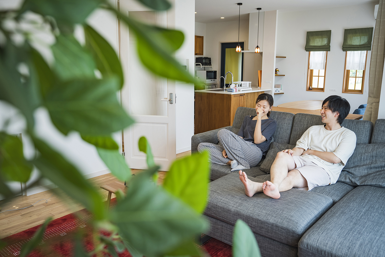 自然光あふれる開放的なリビングルーム。キッチン・ダイニングとつながる家族団らんの空間です。観葉植物がリラックス感をプラス。