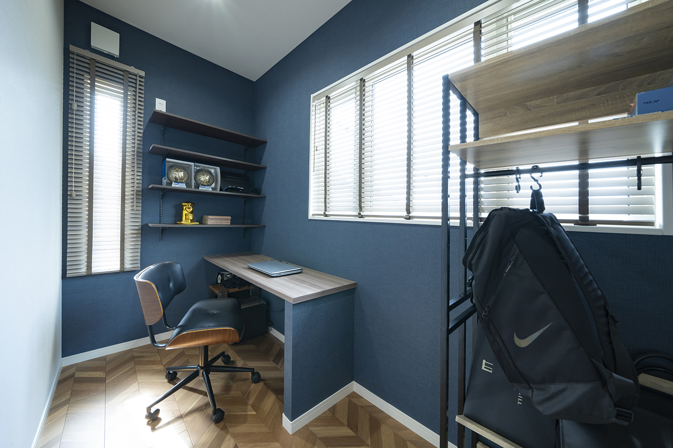 集中しやすい小さなホームオフィス。ブルーの壁とヘリンボーン柄のフローリングが落ち着いた雰囲気を演出し、自然光がやわらかく差し込む空間です。収納も機能的で、おしゃれに仕事や学びをサポートします。