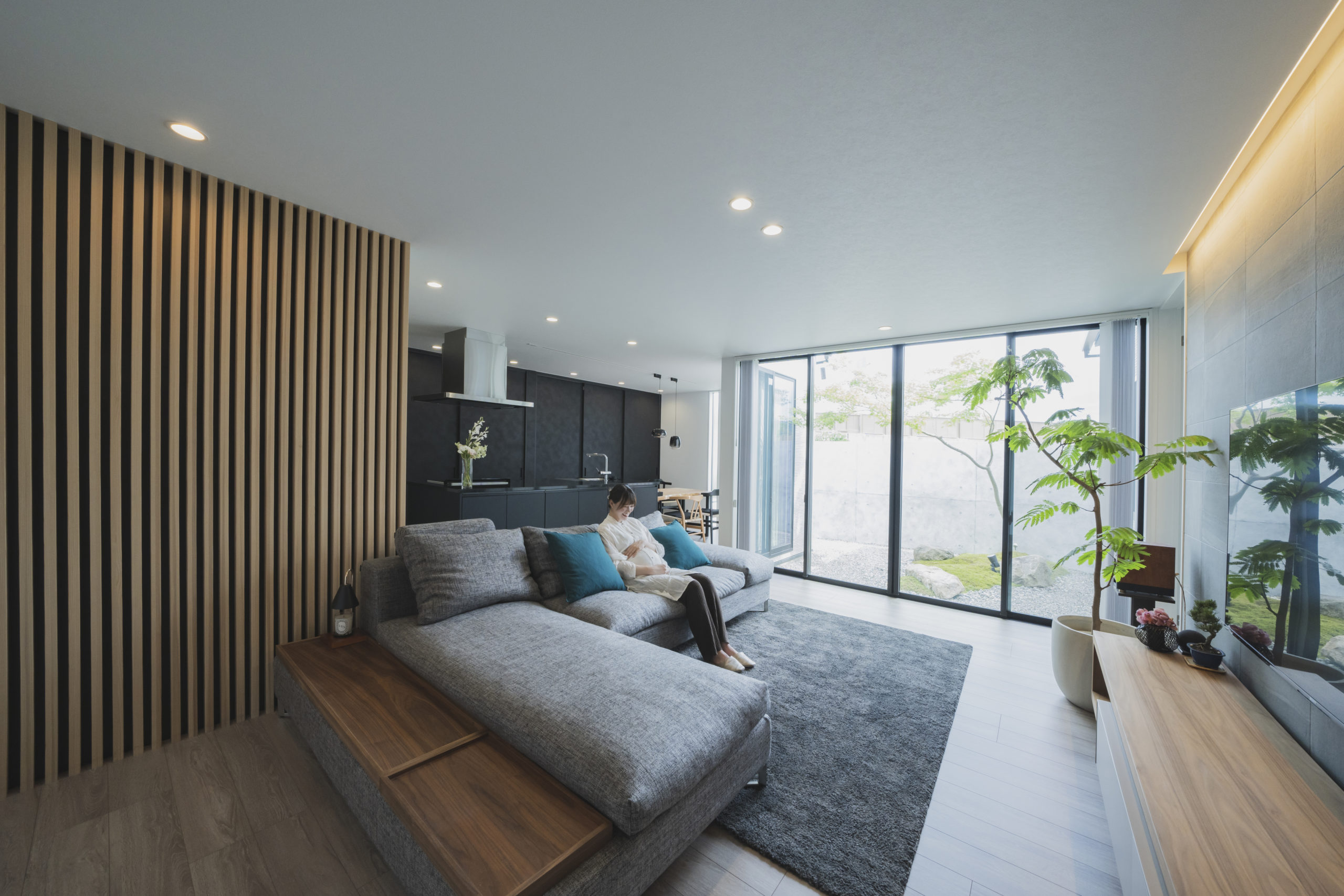 グレーのソファとアクセントのクッションが、居心地の良さを引き立てるリビングルームです。壁掛けテレビやウッドコンソールには植物が配され、センスの良い仕上がりに。自然光がたっぷり注ぐ大きなガラスドアの外には、木々と岩で整えられたシンプルな庭園が広がり、落ち着いた雰囲気を感じられます。