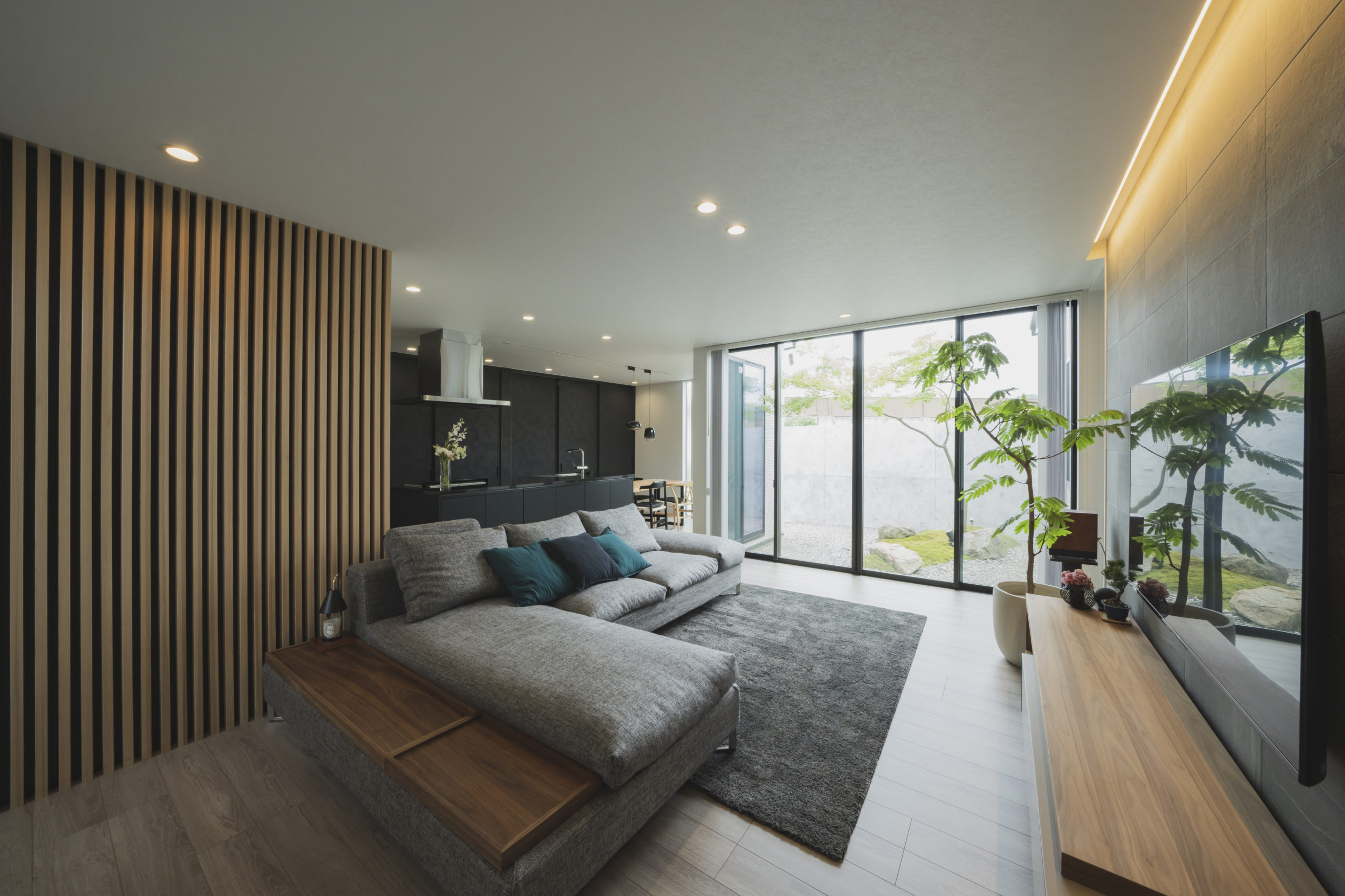 洗練されたデザインと心地よさが調和した家。黒やグレーを基調にしたモダンな内装に、上質な素材感や光の使い方が特徴。広々としたキッチンにはアイランドキッチンがあり、リビングはソファやクッションでリラックスできる空間。そして観葉植物や自然光が、癒しの要素として加わっているのがポイントです。