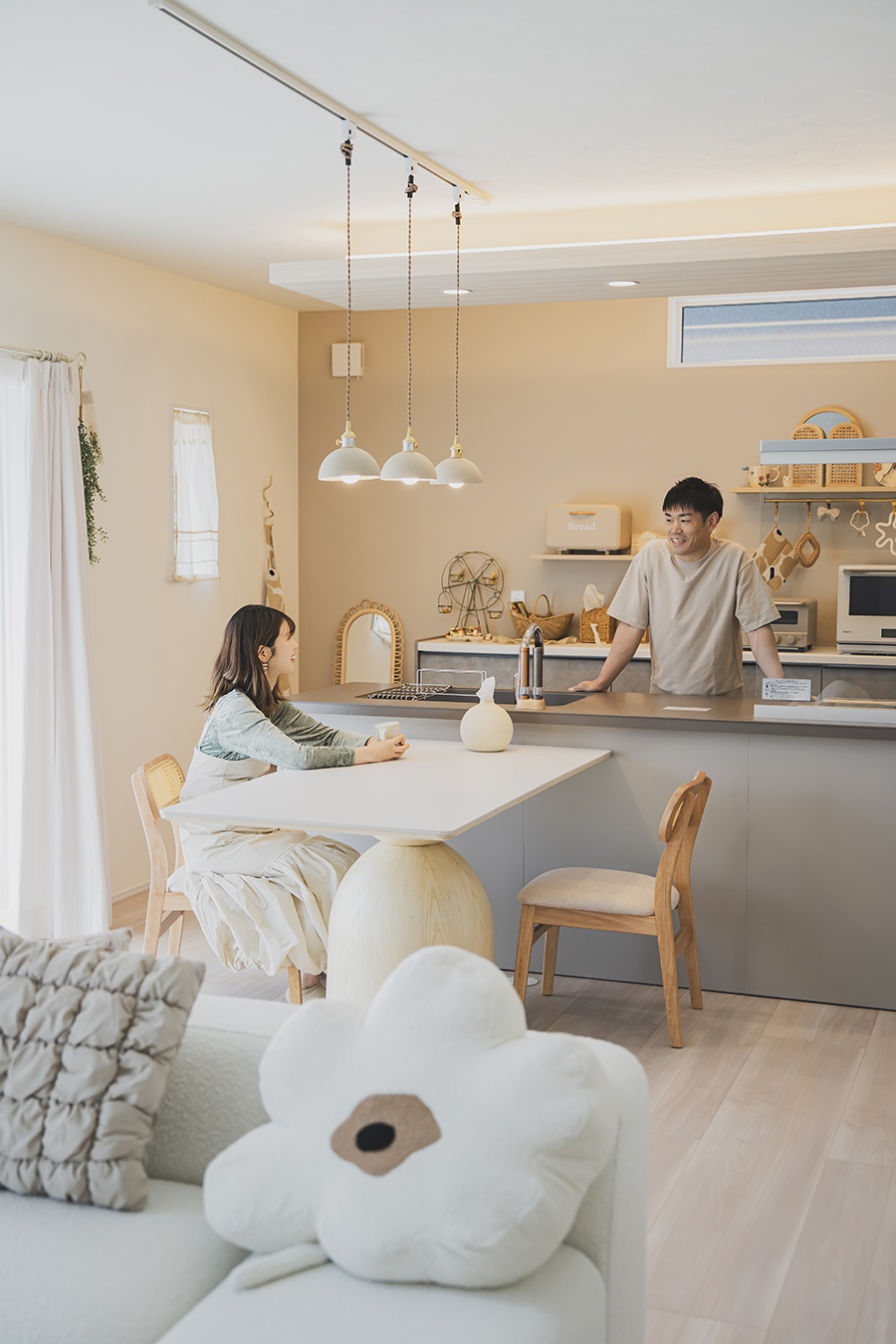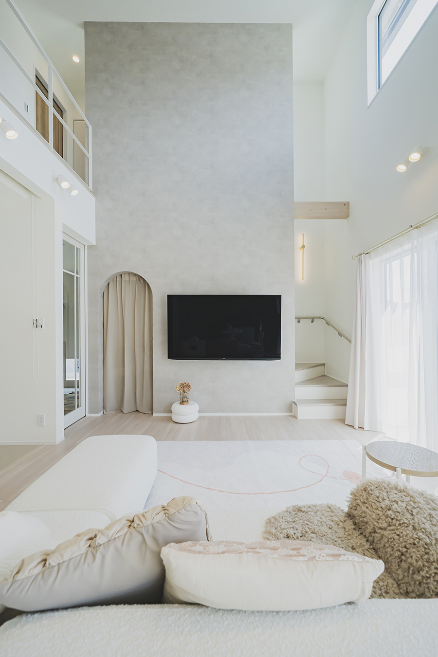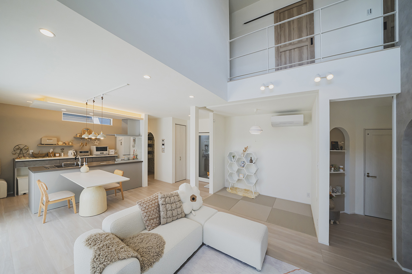 お施主様とはホームオーナー様宅の見学会で初めてお会いしました。その後、1年越しにご縁があり契約に至りました。奥様のご希望を伺いながら可愛らしく広々とした空間づくりを重視し、初めて挑戦するデザインを多く取り入れたお宅です。土地探しから外構提案までトータルでのご提案に喜んでいただき、遮音性や吹き抜けの開放感、大きな窓による明るさなども高評価をいただきました。これからもご家族に明るく楽しい毎日をお過ごしいただけるよう願っています!
