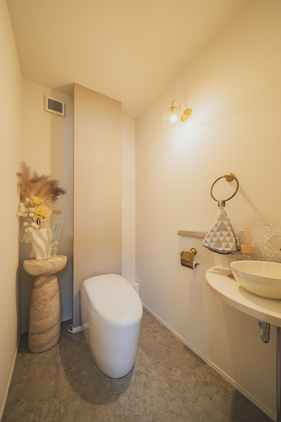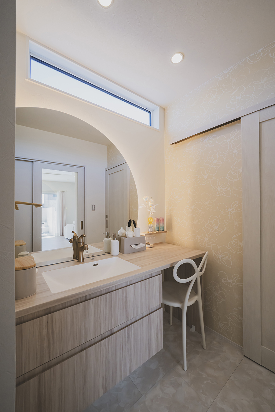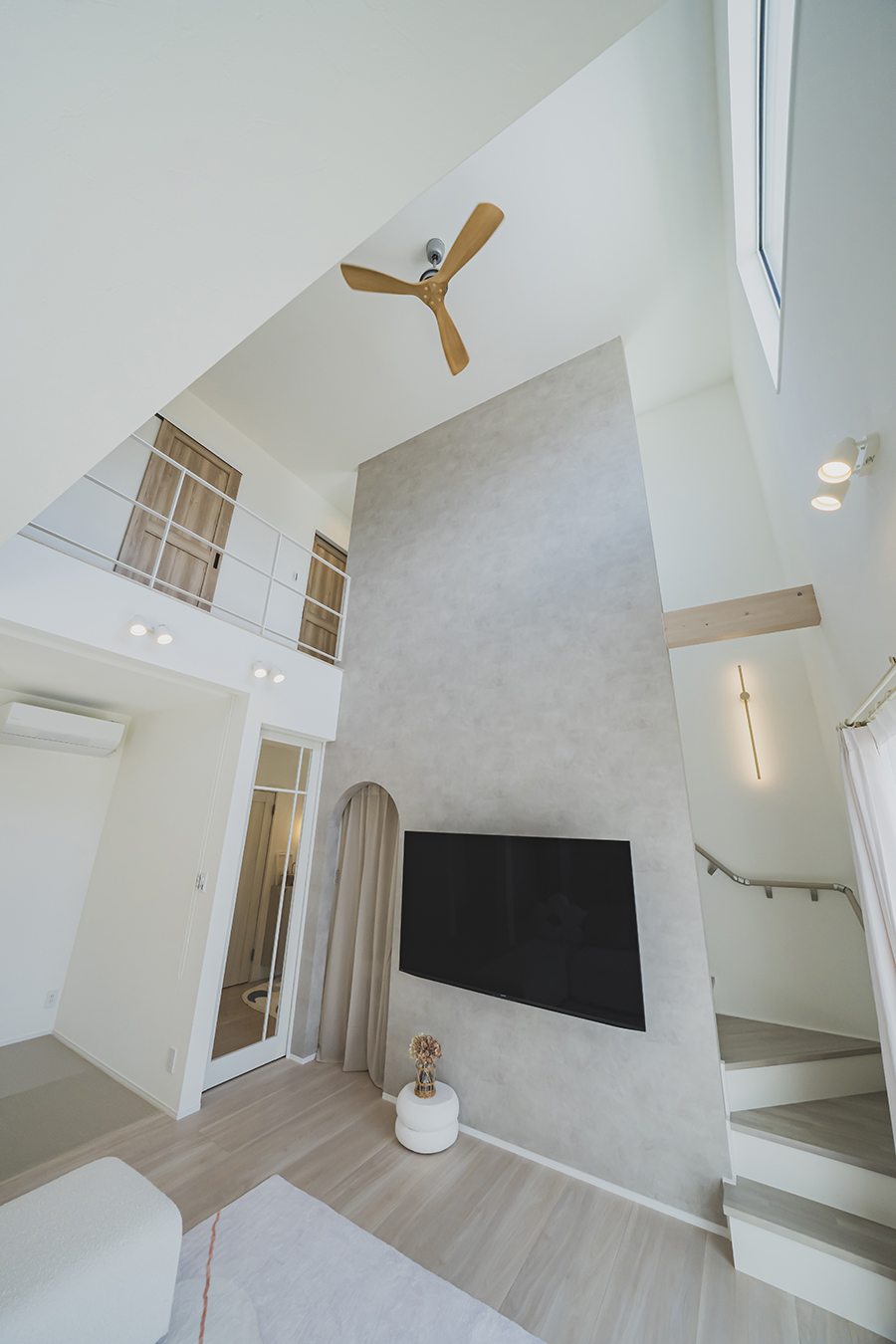 お施主様とはホームオーナー様宅の見学会で初めてお会いしました。その後、1年越しにご縁があり契約に至りました。奥様のご希望を伺いながら可愛らしく広々とした空間づくりを重視し、初めて挑戦するデザインを多く取り入れたお宅です。土地探しから外構提案までトータルでのご提案に喜んでいただき、遮音性や吹き抜けの開放感、大きな窓による明るさなども高評価をいただきました。これからもご家族に明るく楽しい毎日をお過ごしいただけるよう願っています!