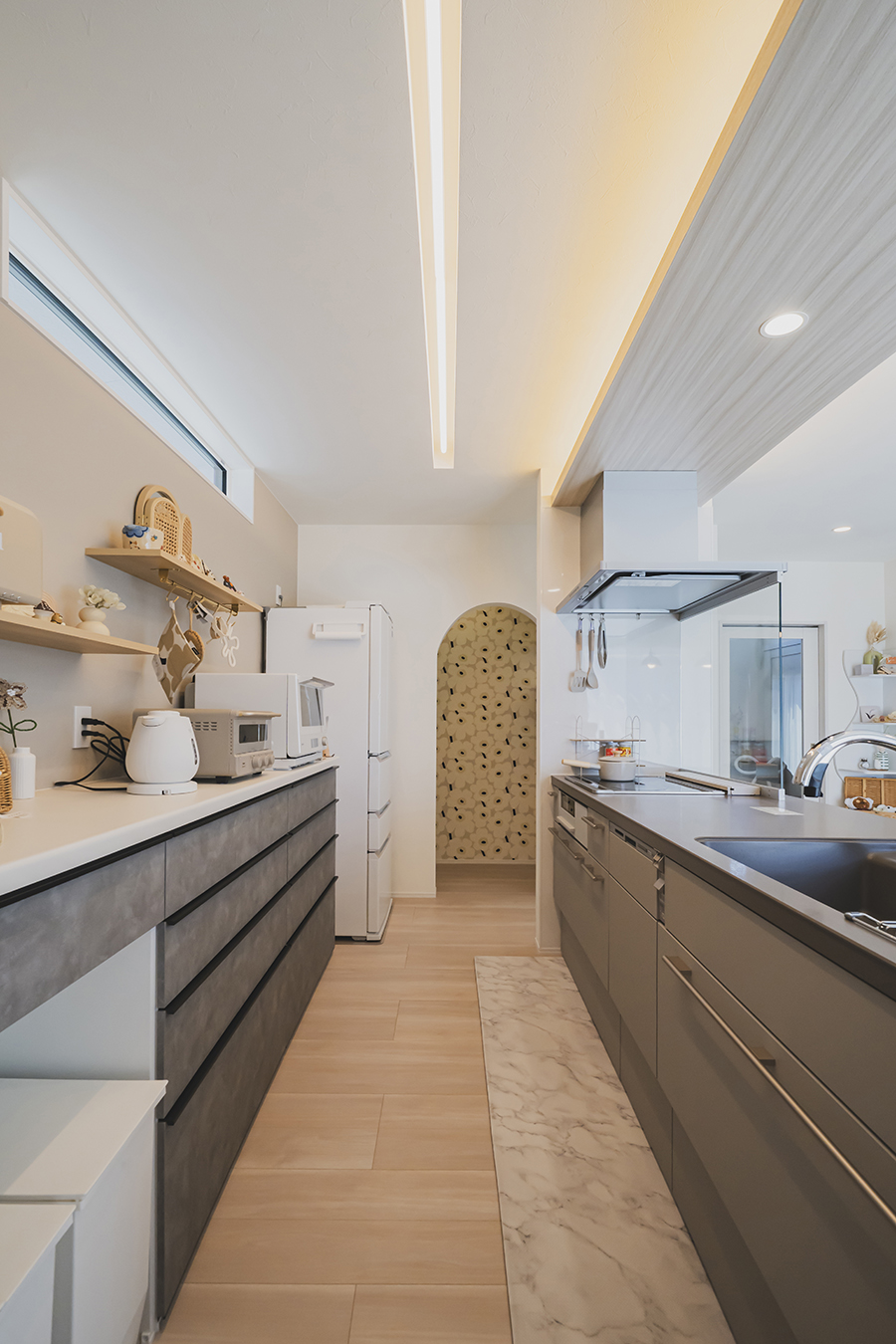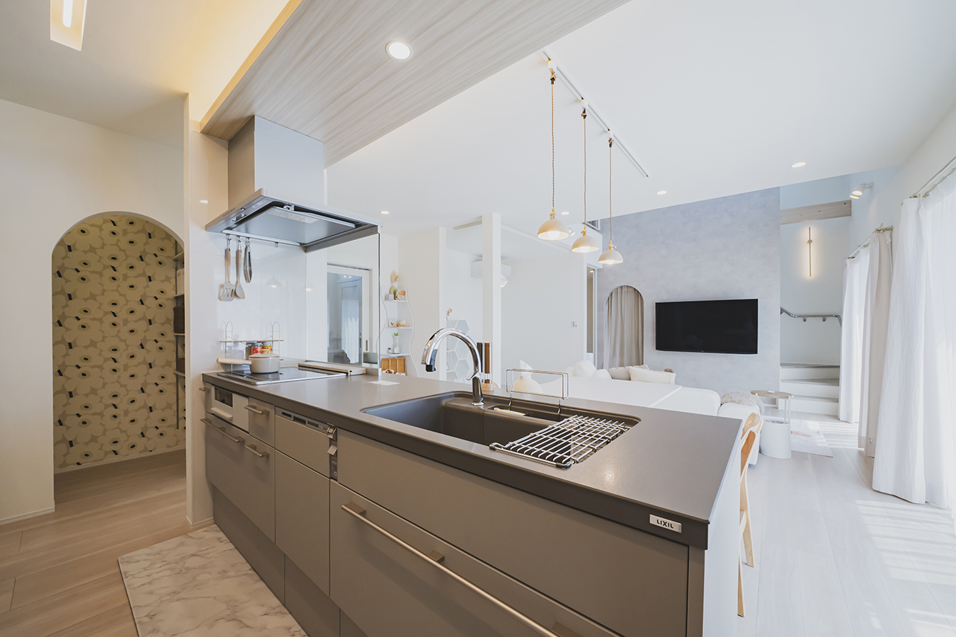 開放感あふれるモダンなリビング空間。アイランドキッチンとテーブルが家族や友人との時間を彩ります。しつらえのデザインがユニークなアクセントになり、自然光と照明の絶妙なバランスで温かな雰囲気が広がります。