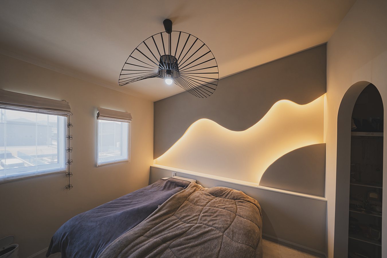 落ち着きと温もりが広がるモダンなベッドルーム。波型のライトが壁を彩り、柔らかな光の演出が心地よさをアップします。大きな窓から自然光が差し込み、シンプルなデザインが空間をすっきりと引き立てています。アーチ型のドアが個性を加え、奥へと続く便利なつながりを感じさせる設計です。
