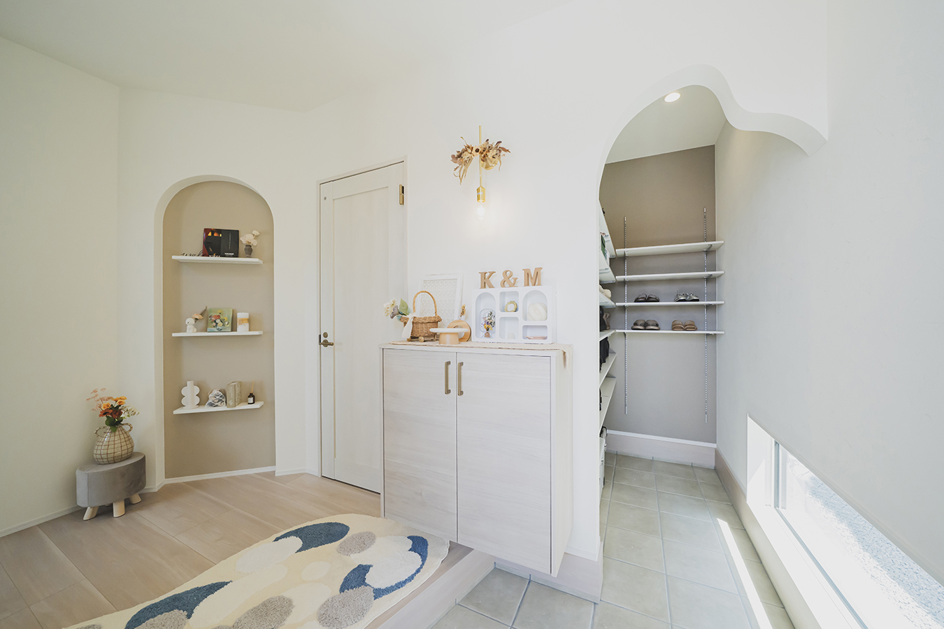 おしゃれで機能的な玄関スペース。白い壁とライトウッドのフローリングが明るさを際立たせ、小物や観葉植物が個性をプラス。棚や収納スペースが充実し、実用性とデザインの調和が感じられる空間です。円形のラグが温かいアクセントを添えています。