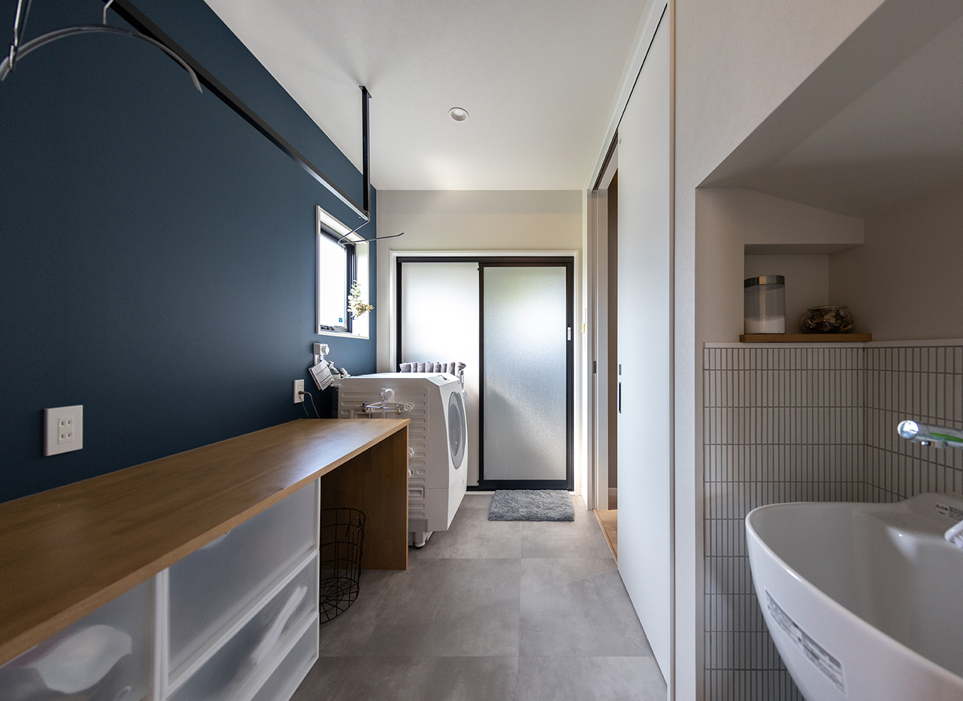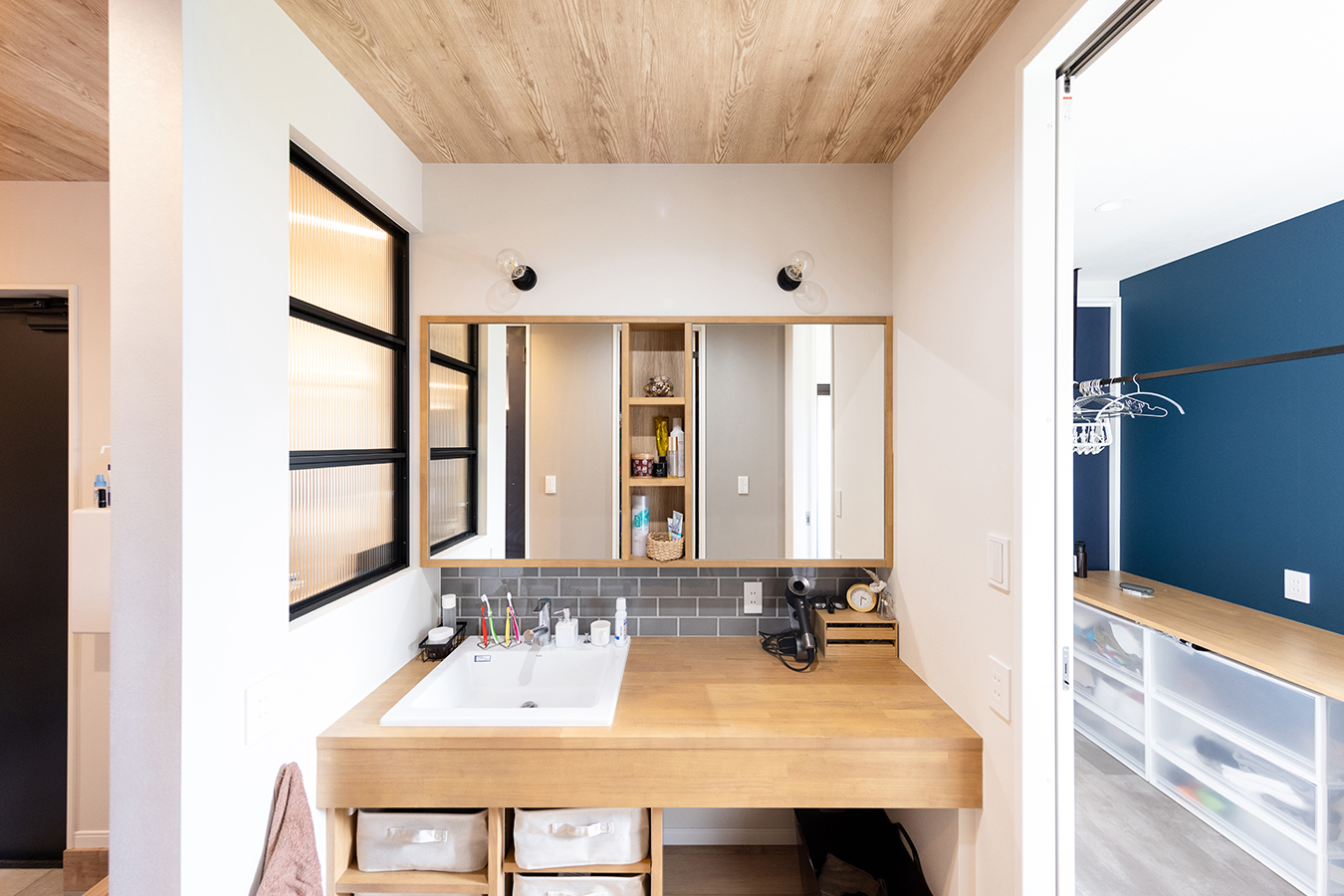 ナチュラルモダンな洗面室。木製カウンターに白いシンクがすっきりとした美しさを際立たせ、グレーのタイル壁が都会的な雰囲気をプラス。窓から柔らかな光が差し込むことで、心地良い清潔感が広がる設計です。