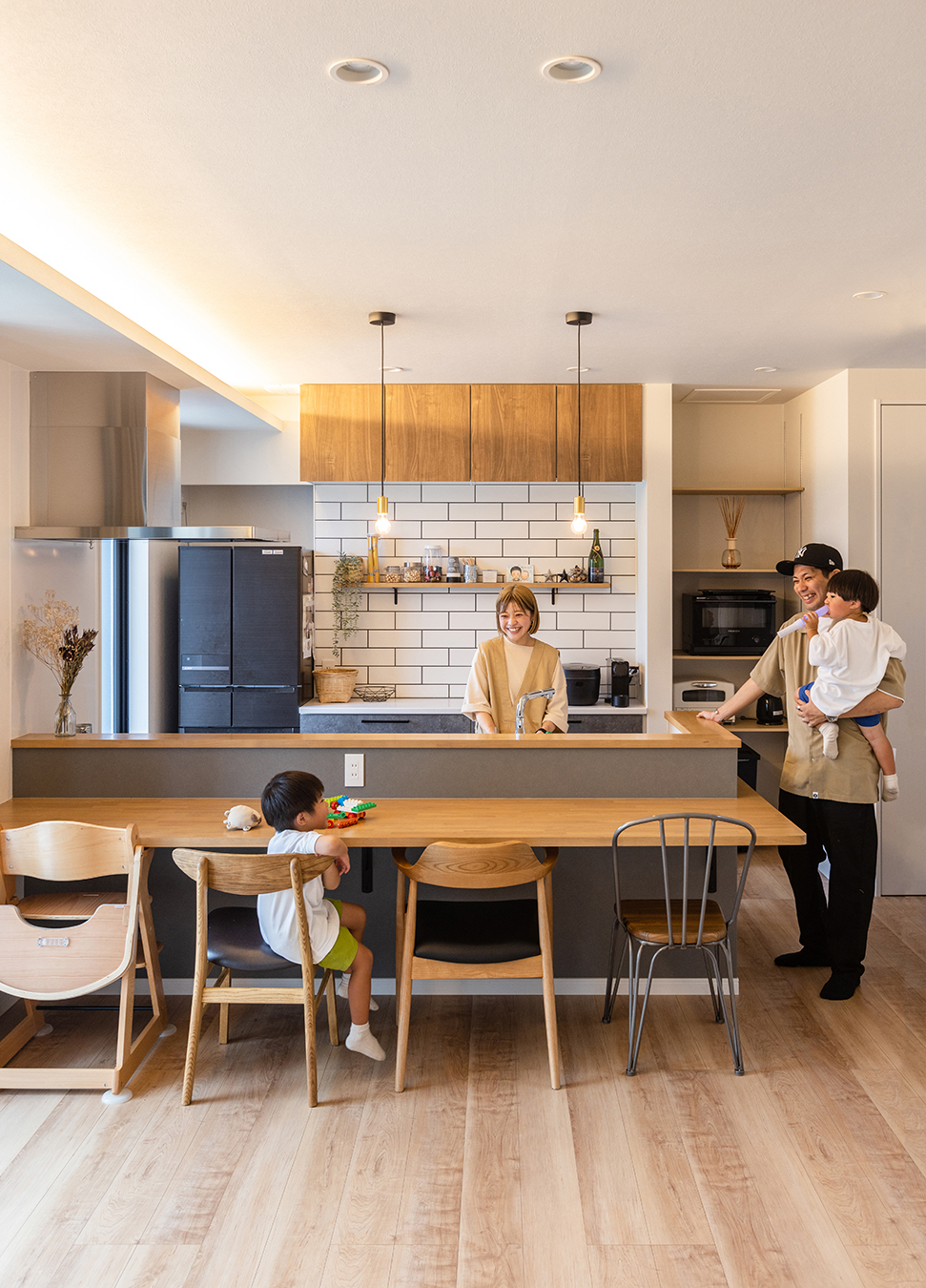 家族の笑顔が広がる温かなキッチン&ダイニング。白いタイルや木製キャビネットが清潔感と居心地の良さを演出します。広いテーブルとハイチェアが日々の団らんを支え、子どもたちの遊ぶ姿が、空間に活気を与えています。自然光と照明が融合し、あたたかい雰囲気が広がる家族の中心地です。
