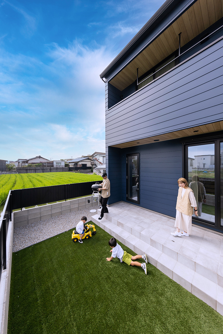 家族で楽しめるお庭。青い外壁が爽やかな印象を与え、芝生の庭では子どもたちが遊び、大人たちはバーベキューを満喫できます。広いガラスドアが内外をつなぎ、明るい自然光が家全体に広がる設計が魅力的です。