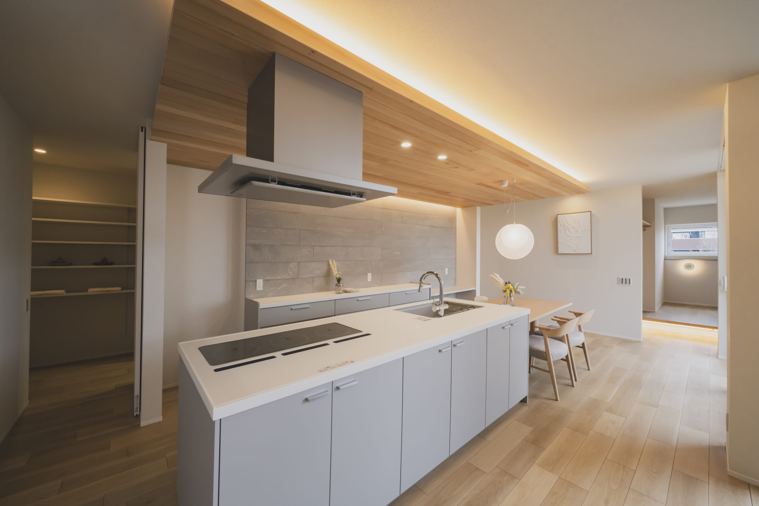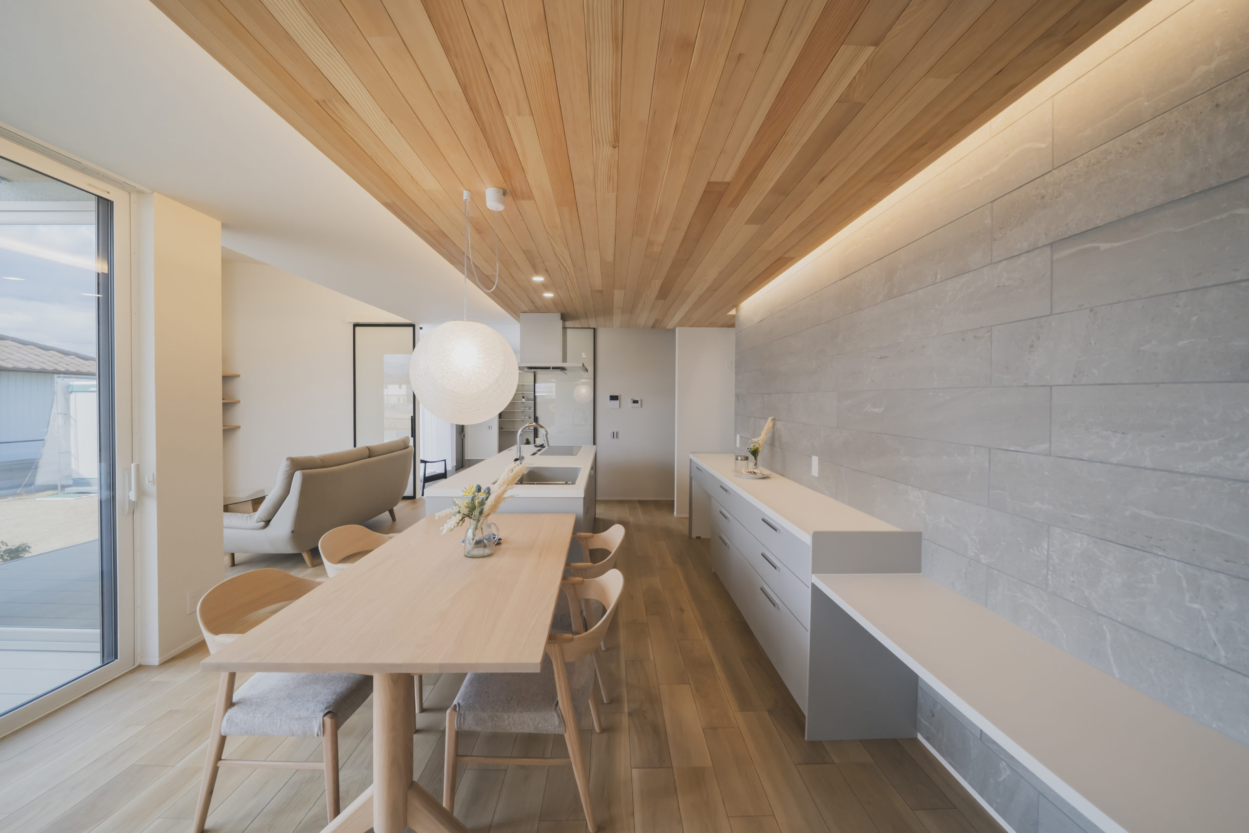 無垢の木の温もりと、グレーを基調としたストーン調の壁面。相反する素材を絶妙なバランスで組み合わせることで、モダンさと安らぎが共存する空間に仕上げました。丸みのあるペンダントライトが、直線的な空間に柔らかなアクセントを添えています。