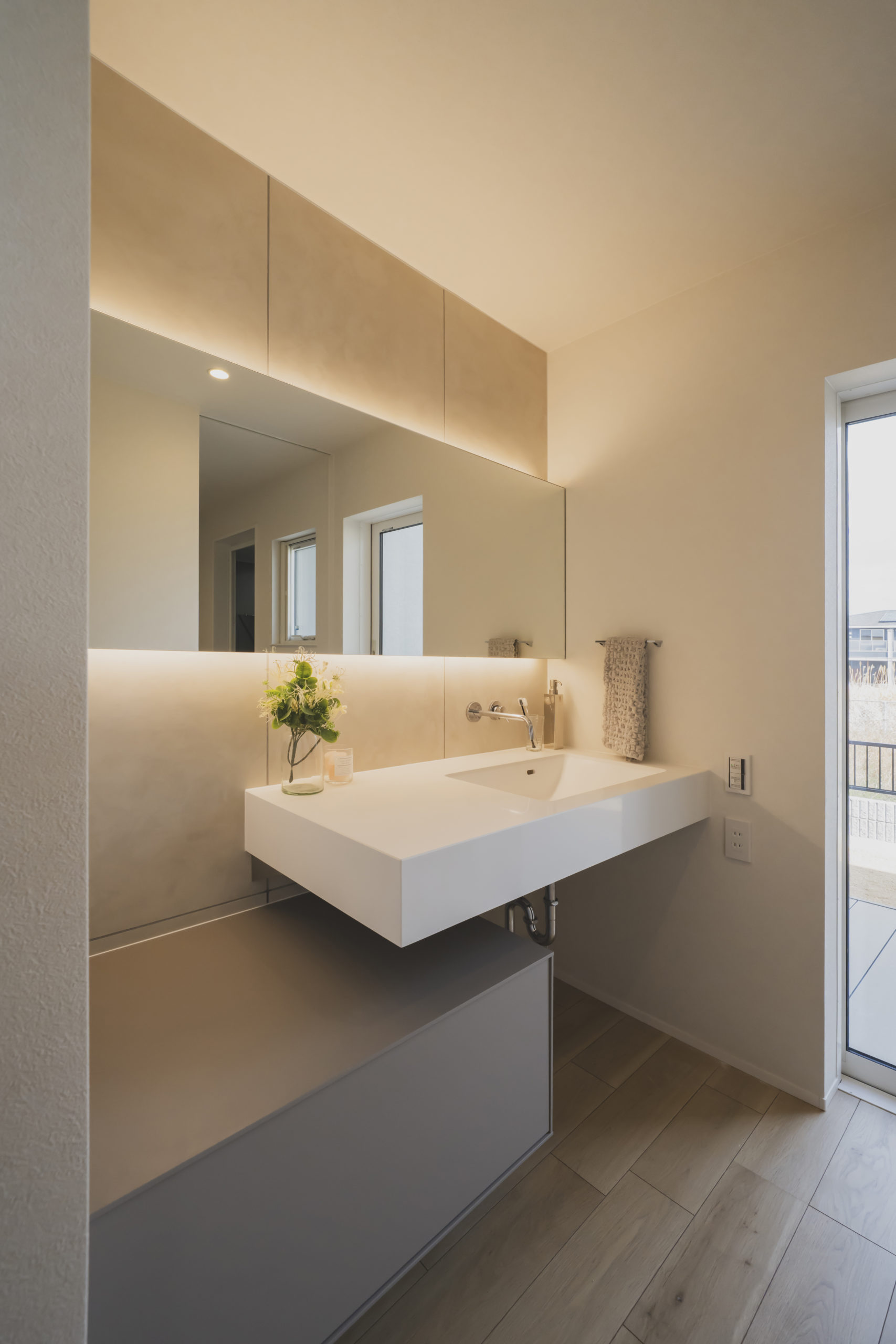 枕元を優しく照らす円形のブラケットライトと、足元から漏れる柔らかな間接照明。直接的な光を抑え、計算された陰影をつくることで、自律神経を整え深い眠りへと導く空間に仕上げました。夜が深まるほどに、その美しさが際立ちます。