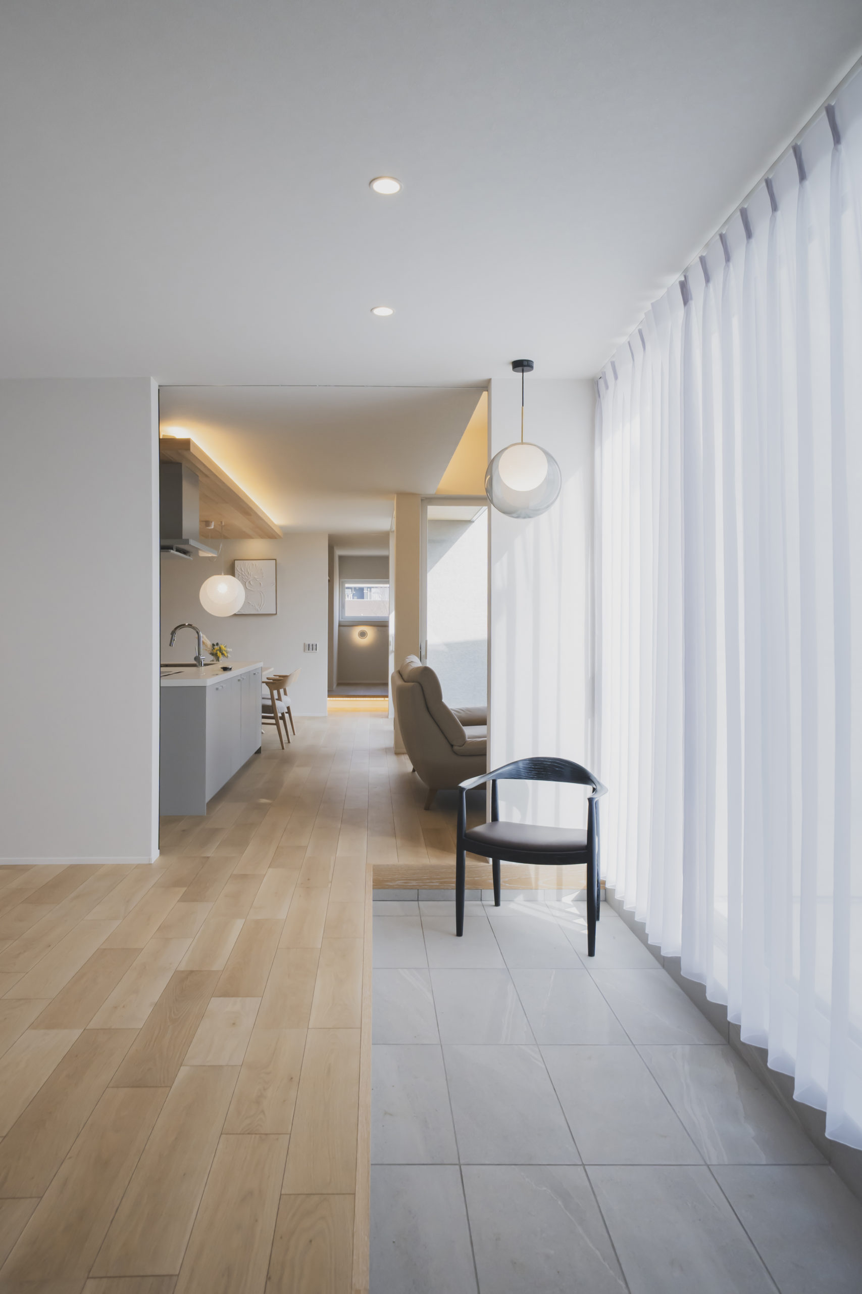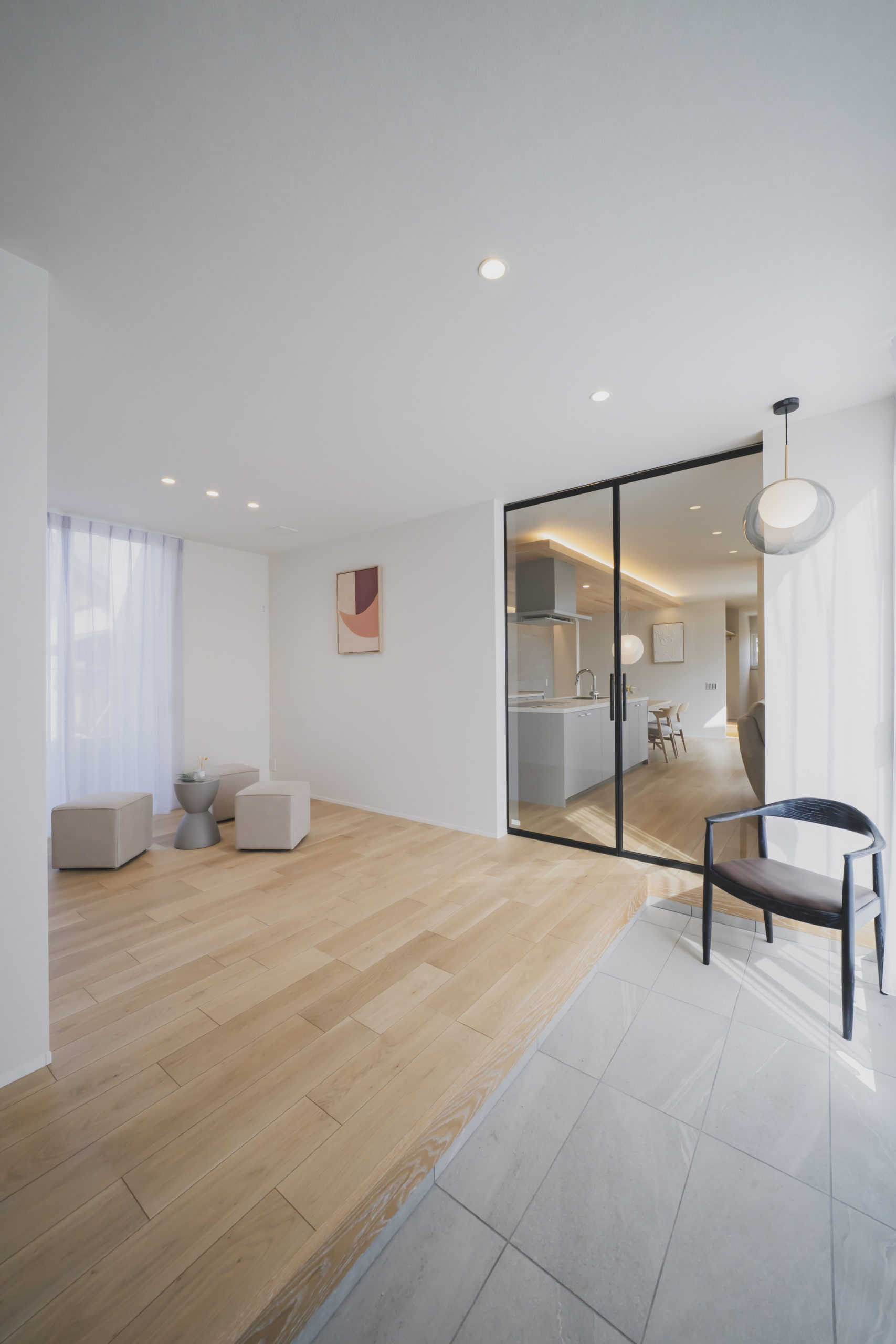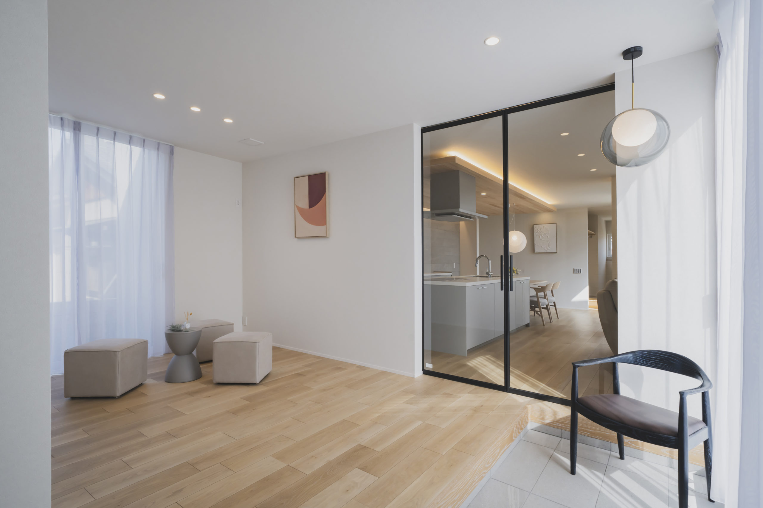 あえて壁で仕切らず、天井まで届く全面透明ガラスの建具を採用することで、視線はそのまま奥のLDKへと突き抜けます。この「視界の連続性」が、実際の面積以上の開放感と、住まい全体の一体感を生み出しています。