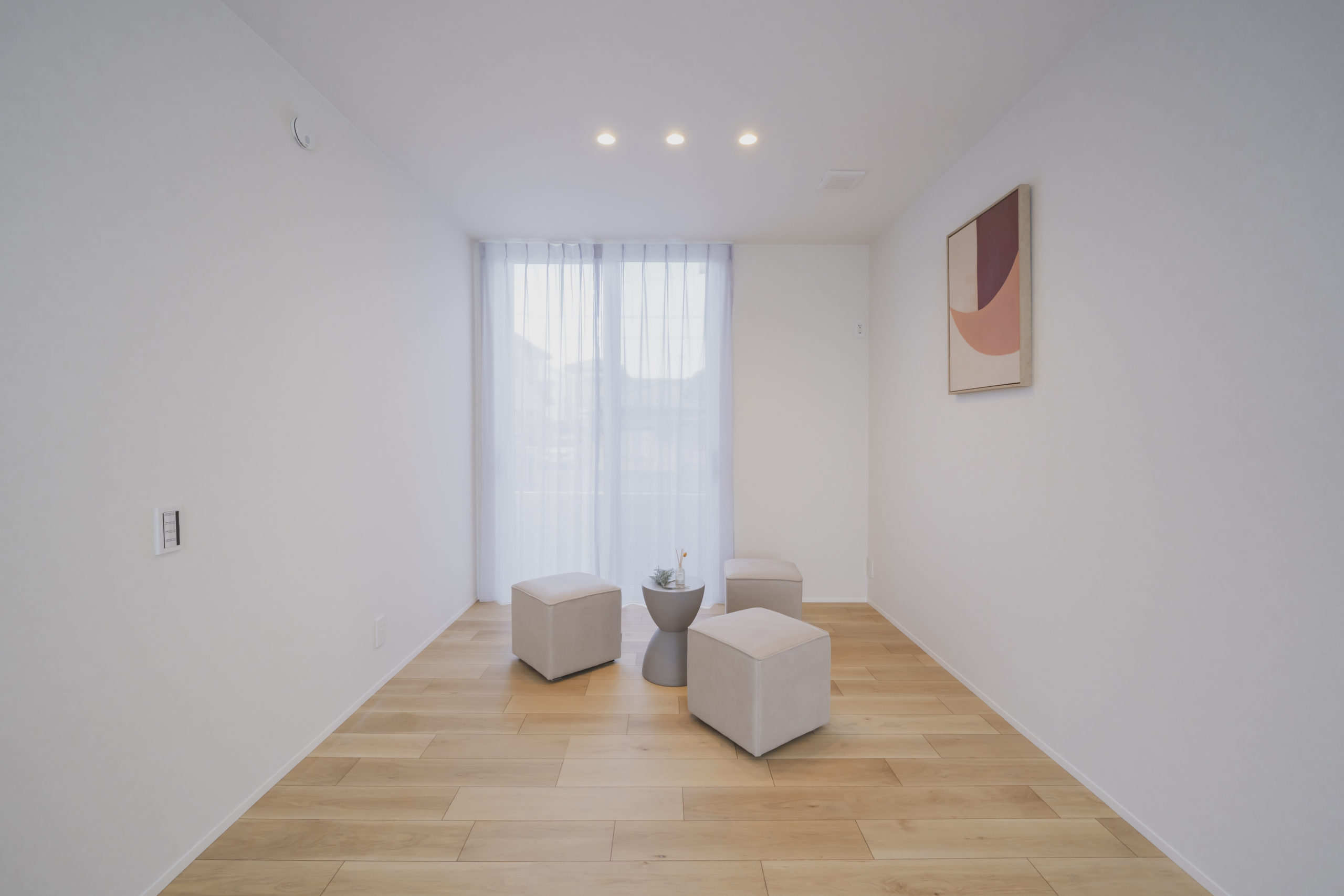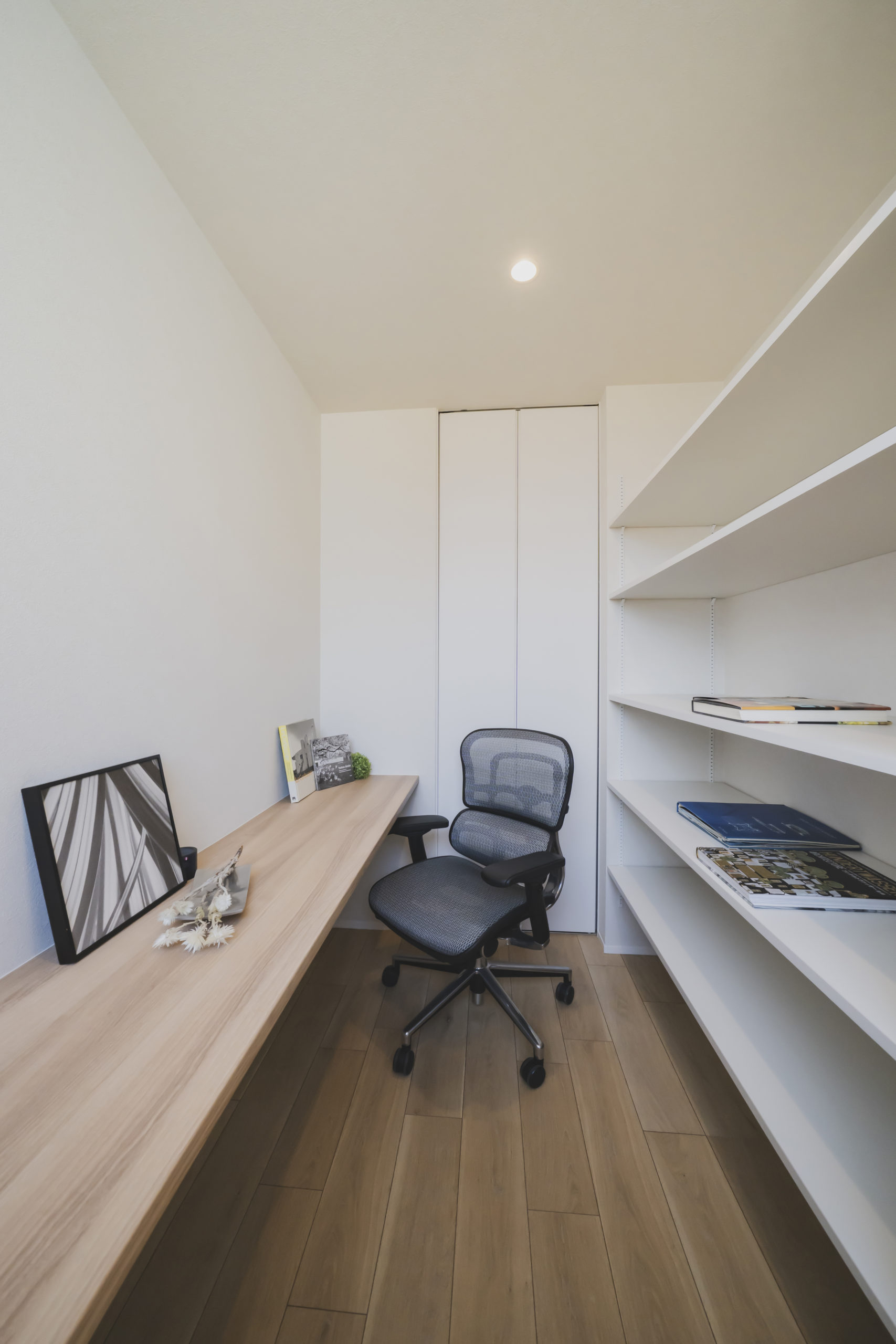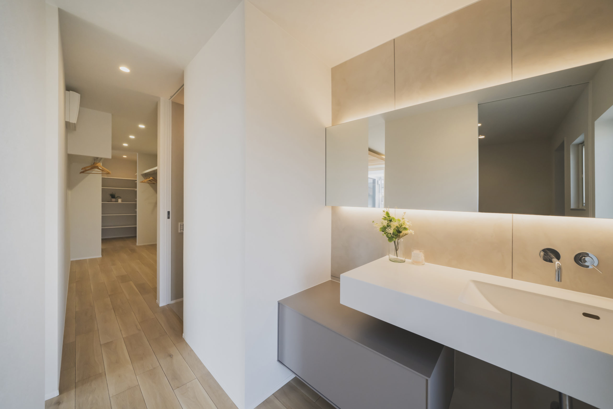 あえて壁で仕切らず、天井まで届く全面透明ガラスの建具を採用することで、視線はそのまま奥のLDKへと突き抜けます。この「視界の連続性」が、実際の面積以上の開放感と、住まい全体の一体感を生み出しています。